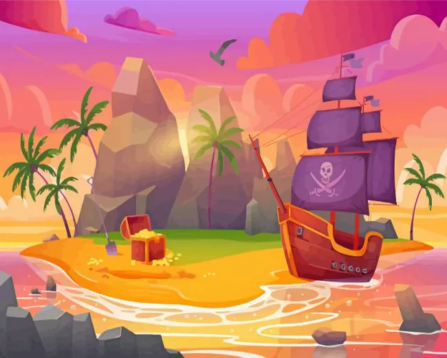 Cartoon Pirate Ship At Sunset Diamond Painting